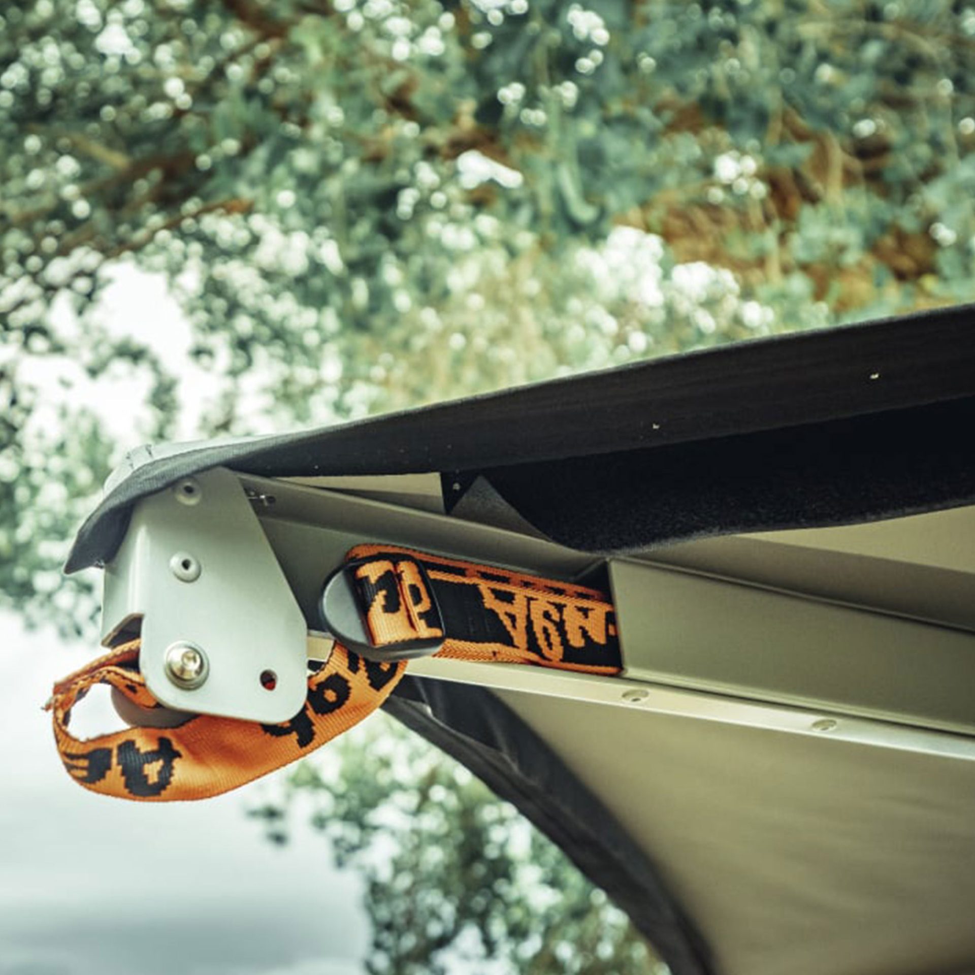 Acest efect de învăluire înseamnă că vă puteți bucura de 10 metri pătrați de adăpost în jurul întregii zone de lucru a vehiculului dvs., în special acolo unde este necesar – în spate, unde sunt depozitate sistemul de sertare, frigiderul și consumabilele. Marchiza are patru brațe din aluminiu rezistente, care se întind pe o rază de 270º, făcând ca aceasta să fie rezistentă la vreme nefavorabilă. Atunci când condițiile se înrăutățesc, brațul central al copertinei are un stâlp rabatabil ascuns care poate fi folosit pentru a fixa copertina pentru un sprijin suplimentar. În plus, fiecare dintre cele patru brațe are o curea de fixare pentru condiții cu rafale puternice.
